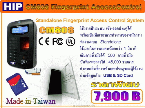Access Control สุดยอดนวัตกรรมเครื่องควบคุมประตู ด้วยลายนิ้วมือ C808 ที่สามารถบริหารจัดการควบคุมการเปิด-ปิด ประตู ได้จากตัวเครื่องเอง(Standalone) และรุ่น C808 C รองรับการทำงานร่วมกับบัตร Proximity ความถี่ 125 KHz อีกทั้งยังสามารถดึงข้อมูลได้ทั้ง USB Communication หรือ ผ่าน SD Card ได้ที่ตัวเครื่องเพื่อลดความยุ่งยากในการเดินสายสื่อสารข้อมูลต่างๆ มาพร้อมกับความเร็วในการอ่านลายนิ้วมือที่มีความเร็วสูงน้อยกว่า 1 วินาที หัวอ่านเป็นแบบไม่มี Polymer สามารถป้องกันรอยขีดข่วนต่างๆ ได้ทั้งหมด ทนต่อการใช้งาน รูปร่างเล็กกระทัดรัดเหมาะกับสถานที่ติดตั้งที่มีพื้นที่จำกัด และเน้นรูปทรงที่ทันสมัยขนาดเล็กมาพร้อมโปรแกรมดึงข้อมูลมาพร้อมกับตัวเครื่อง มั่นใจในคุณภาพจาก HIP ความสามารถของเครื่อง ตัวเครื่องรองรับผู้ใช้ 500 เก็บข้อมูลการบันทึกได้ 45,000 รายการใช้หัวอ่าน Optical CMOS ที่มีความแข็งแรง มีเสียงแจ้งทุกขั้นตอนการทำงาน มีเสียงแจ้งชื่อเมื่อบันทึกผ่าน สแกนได้รวดเร็วภายในเวลา 2 วินาที สามารถเชื่อมต่อได้หลายรูปแบบ เช่น RS232, RS485, TCP/IP, USB Support Ver.2.0 สามารถดึงข้อมูลผ่าน USB Flash Disk โดยที่ไม่จำเป็นต้องเดินสายให้ยุ่งยาก รองรับการใช้งานร่วมกับ Battery Backup สามารถตั้งระบบเปิด-ปิดเครื่องอัตโนมัติตามเวลาที่ต้องการ โหมดระบบประหยัดพลังงาน Sleep mode เมื่อมีผู้ใช้งาน มาพร้อมโปรแกรมบริหารจัดการเวลาการทำงานชองพนักงานที่คำนวณการขาด ลา มาสาย และส่งไปที่โปรแกรม Payroll ได้ทุกชนิด Technical Specification Fetures/Function Communication USB LINK/SD Card Wiegand Wiegand IN/OUT Display Language Standard: English / Thai Optional: Others Time Zone 50/Week per day 8 time zone Alarm Output Open too long/Threaten/Open door IIIegal/Disassemble Algorithm "SMACK FINGER" V3.0 CPU/SRAM/FLASH 500 Attendance Record Capacity 45,000 Effective FP Detection Area 16mm x 14mm Average Recognition Speed 500/1.5 second FRR < 0/01% FAR < 0.0001% Fingerprint Verification 500/1.5 second LCD Display 122x 32LCD Display Input Voltage DC12V Operation Relative Humidity 20% to 60% Operation Temperature 0 องศา to 45 องศา Storage Relative Humidity 20% to 80% Storage Temperature -10% to 65 Dimensions (Unit) 70mm x 110 mm x 30 mm Dimensions (White Box) 275mm x 185mm x 120mm เว็ปไซคบริษัท : http://m-v-computer.tarad.com