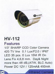 � กล้องอินฟาเรด โซนี่ซีซีดีรุ่นประหยัด ให้ภาพคมชัดประสิทธิภาพสูง HV-112 Features 1/3 SONY CCD Color Camera 420 TV line 0.1 Lux/F2.0 / IP68 LED 28 pcs. 0 Lux 10M IR On Lens Fix 3.6,4,6,8 mm. Day& Night more than 48 dB,(ATW, BLC Auto) Power DC 12V / 120mA& 450mA