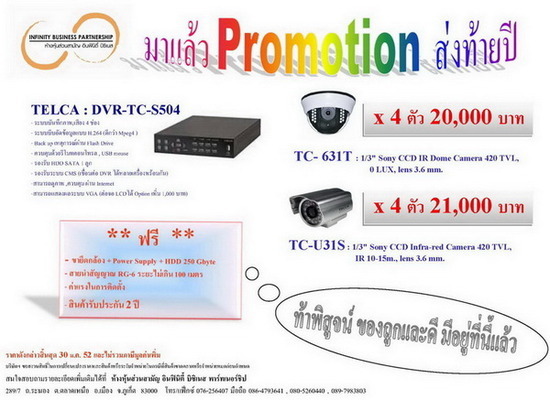 โปรโมชั่นที่ 1 (20,000) 1.กล้อง Dome รุ่น TC-631T -1/3 Sony CCD IR Dome Camera 420 TVL, 0 Lux , Lens 3.6mm. ตัว 2. เครื่องบันทึก DVR TC-S504 -ระบบบันทึกภาพ , เสียง 4 ช่อง -ระบบบีบอัดข้อมูลแบบ H.264 (ดีกว่า Mpeg 4) -Back up เหตุการณ์ผ่าน Flash Drive -ควบคุมด้วยรีโมทคอนโทรล , USB Mouse -รองรับ HDD SATA 1 ลูก -รองรับระบบ CMS (เชื่อมต่อ DVR ได้หลายเครื่องพร้อมกัน) -สามารถดูภาพ , ควบคุมผ่าน Internet -สามารถแสดงผลระบบ VGA (ต่อจอ LCD ได้ Option เพิ่ม 1,000 บาท) ** ฟรี -ขายึดกล้อง + Power Supply + HDD 250 GB -สายนำสัญญาณ RG-6 ระยะไม่เกิน 100 เมตร -ค่าแรงในการติดตั้ง สินค้ารับประกัน 2 ปี โบรโมชั่นที่ 2 (21,000) 1.กล้อง IR Camera รุ่น TC-U31S (21,000) -1/3 Sony CCD IR Camera 420TVL, IR 10-15m. , lens 3.6mm. 4 ตัว 2. เครื่องบันทึก DVR TC-S504 -ระบบบันทึกภาพ , เสียง 4 ช่อง -ระบบบีบอัดข้อมูลแบบ H.264 (ดีกว่า Mpeg 4) -Back up เหตุการณ์ผ่าน Flash Drive -ควบคุมด้วยรีโมทคอนโทรล , USB Mouse -รองรับ HDD SATA 1 ลูก -รองรับระบบ CMS (เชื่อมต่อ DVR ได้หลายเครื่องพร้อมกัน) -สามารถดูภาพ , ควบคุมผ่าน Internet -สามารถแสดงผลระบบ VGA (ต่อจอ LCD ได้ Option เพิ่ม 1,000 บาท) ** ฟรี -ขายึดกล้อง + Power Supply + HDD 250 GB -สายนำสัญญาณ RG-6 ระยะไม่เกิน 100 เมตร -ค่าแรงในการติดตั้ง สินค้ารับประกัน 2 ปี