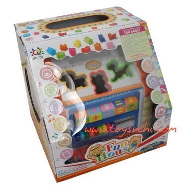 บ้านกิจกรรม พร้อมบล็อคหยอด รูปทรงต่างๆ ทำให้น้องๆเพลินเพลิด เพราะมีลูกเล่นหลากหลาย มีเสียงเพลงเยอะ มีไฟ สามารถเล่นทั้งหมด 4 ด้าน ดังนี้ 1. ด้านแรก ฝึกให้น้อง ๆ ได้ใช้กล้ามเนื้อมัดเล็ก ในการดึงกุญแจมาหมุนเพื่อเปิดประตู พร้อมทั้งเก็บกุญแจ 2. ด้านที่2 จะสอนให้น้องๆ รู้จักเรื่องสีและเรื่องรูปทรงแบบต่างๆ โดยในส่วนของหลังคา จะเป็นบล็อคหยอดรูปสัตว์ต่างๆ เมื่อหยอดแล้วจะมีเสียงสัตว์ตามที่หยอด และเสียงดนตรี ส่วนของฝาบ้าน จะเป็นบล็อคหยอดรูปทรงต่างๆ 3. ด้านที่ 3 ด้านฝาบ้าน จะสอนน้องๆเรื่องการบวก ลบ คูณ และหาร ส่วนแถวกลาง เป็นลูกปัดหลากสี ช่วยสอนน้องๆในเรื่องสี และนับเลข สุดท้ายก็แถวล่างสุด จะเป็นออร์แกน สามารถเปลี่ยนให้เป็น คีย์โน้ตดนตรี หรือ เล่นเพลงก็ได้ 4. ด้านที่ 4 จะสอนให้เรียนรู้ถึงสัมผัสที่แตกต่าง โดยด้านนี้จะเป็นยางนิ่ม ๆ ไม่เป็นอันตรายกับเด็ก ไว้ให้น้องๆ ล้วงหยิบสิ่งของที่อยู่ ในบ้านได้ค่ะ ซึ่งส่วนใหญ่น้องๆ จะไม่กล้าล้วงมือเข้าไปสัมผัสข้างในบ้าน ต้องให้เวลาน้องๆ ได้เรียนรู้และทำความคุ้นเคยอีกสักระยะค่ะ