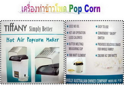 เครื่องทำข้าวโพด POP CORN เครื่องทำข้าวโพด POP CORN ระบบลมร้อนช่วยให้การทำป๊อปคอร์นเป็นเรื่องง่ายดายเสร็จเร็วภายใน 2 นาที เพียงใส่ข้าวโพด ลงในเครื่องโดยไม่ต้องใส่เนยหรือน้ำมันและกดปุ่ม ท่านก็จะได้ป็อปคอร์นไว้เป็นอาหารว่างหรือทานเล่นขณะอยู่ที่บ้าน ดูหนัง หรือฟังเพลง ทานได้ทั้งบ้านอย่างเพลิดเพลิน ราคาเพียง 850 บาท ติดต่อคิ้ม 0866296335 ดูสินค้าอื่นเราได้ที่ http://shop.be2hand.com/cybermart">http://shop.be2hand.com/cybermart