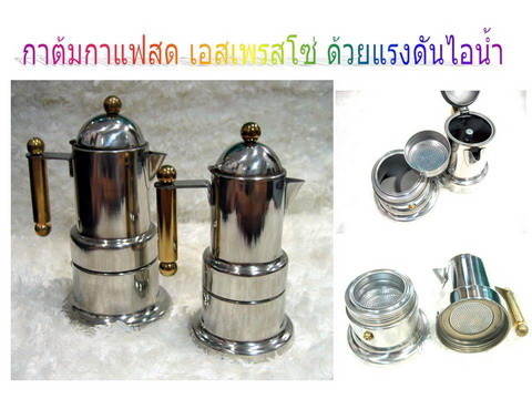 เครื่อง ทำกาแฟสด กาต้มกาแฟสด สไตล์ อิตาลี ใช้ง่าย สะดวกสบาย แต่รสชาติดีเยี่ยมเหมือนเครื่องทำกาแฟแบบไอน้ำแพง ๆ แต่นี่สามารถพกติดตัวไปได้ทุกที่ ทุกเวลา ไม่ว่าจะไป เดินป่า กางเต้น เข้าค่าย หรือ ไปที่ใหนๆ ก็สามารถอร่อยกับกาแฟสดได้ใช้ระบบแรงดันของไอน้ำแรงดันประมาณ 15 บาร์ สามารถใช้กับเตาแก๊ส และ เตาไฟฟ้า เชื้อเพลิงแอลกอฮอ สามารถพกติดตัวไปอร่อยได้ทุกที่ๆ รสชาติเทียบได้กับเครื่องราคาหลายหมื่น ตามร้านกาแฟสดชั้นนำทั่วไป โดยใช้เวลาในการทำเพียง 3 นาทีเท่านั้น ตัวเครื่องทำมาจากสแตนเลสอย่างดี ทนความร้อน และ ไม่ดำ อายุใช้งานยาวนาน(ต่างจากแบบราคาถูกที่ทำจากอลูมิเนียม ซึ่งมีสารพิษ ตอนนี้ร้านต่าง ๆ กม.ห้ามไม่ให้ใช้หม้อต้มอาหารอลูมิเนียมแล้ว) สามารถใช้กับกาแฟคั่วบดทั่วๆ ไปตามห้างสรรพสินค้า เช่น อาราบิกา มอคค่า เอสเปรสโซ คาปูชิโน และ อื่นๆ อีกมากมาย นอกจากนั้นยังสามารถนำมาทำ โอเลี้ยง ชาดำเย็น หรือ แม้กระทั้ง กาแฟโบราณ ก็ยังได้ ขั้นตอนง่ายๆ เพียง 3 ขั้นตอน คือ 1. เติมน้ำลงไปใน แก้วส่วนล่าง ให้พอดีขอบล่างตรงจุกทองเหลือง 2. นำกาแฟคั่วบดใส่ในกรวยให้พอดีเต็มอัดแน่นพอประมาณ และ นำกรวยสวมทับไปบนแก้วที่เติมน้ำแล้ว 3. นำส่วนบนมาประกอบกับส่วนล่าง และ นำไปต้มให้จนน้ำเดือด จะเกิดแรงดันสูญญากาศ ดูดไอน้ำผ่านผงกาแฟบดขึ้นมายังแก้วส่วนบน เพียงเท่านี้ก็ได้กาแฟสดรสเยื่ยมมาดื่มแล้ว ไม่ต้องเสียเงินไปซื้อกาแฟสดแพง ๆอีกต่อไป.... ดูวิธีละเอียดในเมนูบทความ ราคา กาต้มกาแฟสดสำหรับ 1 ถ้วย 900 บาท สำหรับกาแฟสด 2 ถ้วย ราคา 1200 บาท ติดต่อคิ้ม 0866296335 ดูสินค้าอื่นเราได้ที่ http://shop.be2hand.com/cybermart
