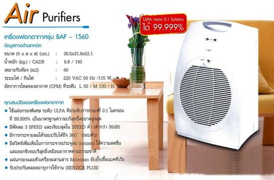 เครื่องฟอกอากาศ BIONAIRE BAP-1560 ข้อมูลทางเทคนิค ขนาด (กว้าง x ลึก x สูง ,cm.) 30.5x31.8x52.1 น้ำหนัก (kg.) 6.8 เหมาะกับห้อง , (m2) 30-40 ระบบไฟ 220 VAC 50 Hz (W) 115 อัตราการไหลของอากาศ (m3/h) ที่ระดับ L,M และ H 50 /130 / 180 อายุการใช้งานของแผ่นกรอง : - Activated Carbon 3 – 6 เดือน ULPA 1 – 3 ปี คุณสมบัติของเครื่องฟอกอากาศ • ใช้แผ่นกรองพิเศษ ระดับ ULPA คือระดับการกรองที่ 0.1 ไมครอนที่ 99.999% เป็นมาตรฐานความบริสุทธิ์สะอาดสูงสุด (Top Rated Fineness Level) มีศักยภาพในการขจัดมลภาวะจุลชีพ แบคทีเรีย รวมไปถึง ไวรัส • เป็นระบบ No Escape / Vacuum Seal ระหว่างตัวเครื่อง (Housing) และแผ่นกรอง (Filter) ขจัดอากาศส่วนเล็ดรอด (By-Pass Air) • ใช้แผ่นกรองที่ผ่านกรรมวิธียับยั้งและขจัดแบคทีเรียและเชื้อโรคฯ (Microban Treated Filter) คือ ปลอดเชื้อได้ 99.99% • ผ่านการรับรองจาก AHAM โดยมี CADR ถึง 140 CFM • มี Electronic filter monitor สัญญาณไฟแสดงให้ทราบว่าถึงเวลาเหมาะสมที่จะเปลี่ยนแผ่นกรอง ULPA • มีพัดลม 3 SPEED และเงียบสุดใน SPEED ต่ำ (ต่ำกว่า 30 dB ) • มีการกระจายลมได้รอบปรับได้ถึง 360 องศา (รอบตัว) • มีสวิชท์เพิ่มเติมในการกระจายประจุลบ (ioniser) ให้ความสดชื่นและออกซิเจนบริสุทธิ์เหมือนอากาศตามธรรมชาติ • รับประกันตลอดอายุการใช้งาน ภายใต้ระบบ Service Plus ฟรีค่าจัดส่ง