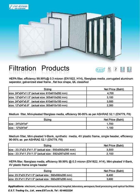 HEPA Filter , MEDIUM Filter ,Per Filter E.S.T. TRADING CO, LTD, TEL 02-6622224 Filter http://www.est.co.th/">www.est.co.th ฟิวเตอร์ ฟิวเตอร์กรองอากาศ HEPA ฟิวเตอร์ และ Medium ฟิวเตอร์ สนใจสอบถาม บริษัท อี.เอส.ที.เทรดดิ้ง จำกัด โทร 02-6622224 http://www.est.co.th/">www.est.co.th
