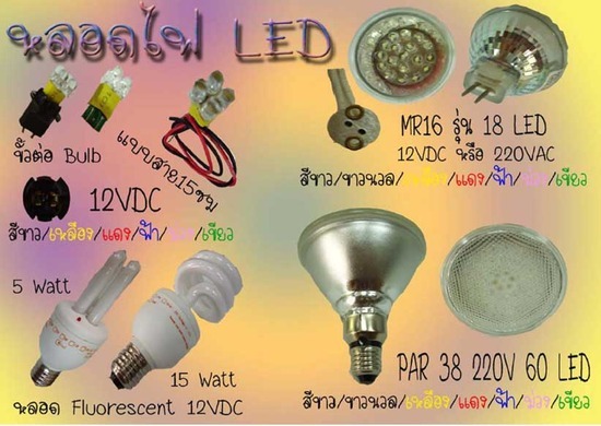 หลอด LED ไฟหรี่รถยนต์ รถมอเตอร์ไซด์ สีขาว ม่วง ฟ้า เขียว เหลือง และกระพริบเจ๊ดสี (ใหม่ล่าสุด) รวมสารพัดหลอด LED จะเป็น MR16 หรือ PAR ทุกสี มีหลายรุ่นหลายแบบและรับประกอบงานตามสั่งสามารถเข้าไปชมได้ที่ http://www.thaishop.fcsolution.com/">http://www.thaishop.fcsolution.com/ หรือ โทรมาสอบถามกันได้ที่ 086-5495477 คุณเกศินี ติดต่อ 02-7461123-4