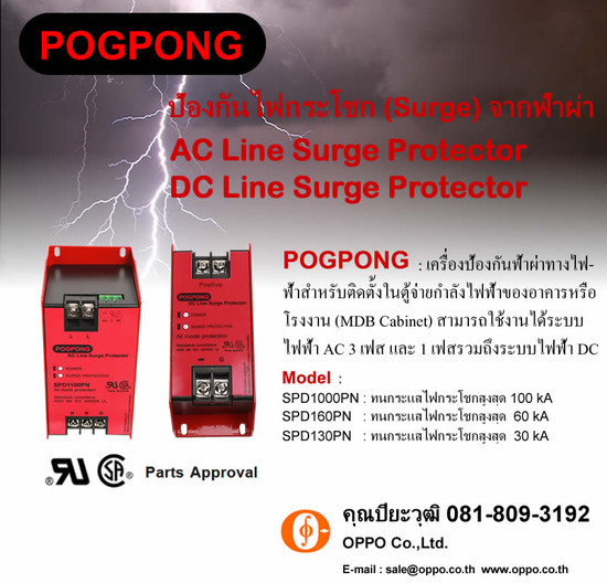 POGPONG- Surge Protector เครื่องป้องกันไฟกระโชก หรือ ไฟกระชาก ที่เกิดจากฟ้าผ่า POGPONG : เครื่องป้องกันฟ้าผ่าทางไฟฟ้าสำหรับ ติดตั้งในตู้จ่ายกำลังไฟฟ้าของอาคารหรือ โรงงาน (MDB Cabinet) สามารถใช้งานได้ระบบ ไฟฟ้า AC 3 เฟส และ 1 เฟสรวมถึงระบบไฟฟ้า DC Model : SPD1000PN : ทนกระแสไฟกระโชกสูงสุด 100 kA SPD160PN : ทนกระแสไฟกระโชกสูงสุด 60 kA SPD130PN : ทนกระแสไฟกระโชกสูงสุด 30 kA มาตราฐานสากล UL Parts Approve Visit us at http://www.oppo.co.th/" target='_blank' rel='nofollow'>www.oppo.co.th Contact us at E-mail: [email protected] ติดต่อ คุณปิยะวุฒิ Tel: 081-809-3192