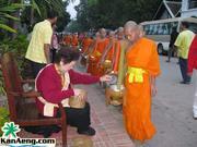 ข้าวเหนียว แด่พระสงฆ์จำนวนเป็นร้อยๆรูปเดินเรียงรายอยู่บริเวณ กลางเมือง