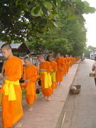 06.00 น . ตื่นเช้าสัมผัสอากาศของหลวงพระบางได้ยินระฆังกังวาลไปทั่วเมืองสัญญาณบุญ นำท่านไปร่วม ทำบุญตักบาตรข้าวเหนียว แด่พระสงฆ์จำนวนเป็นร้อยๆรูปเดินเรียงรายอยู่บริเวณกลางเมือง