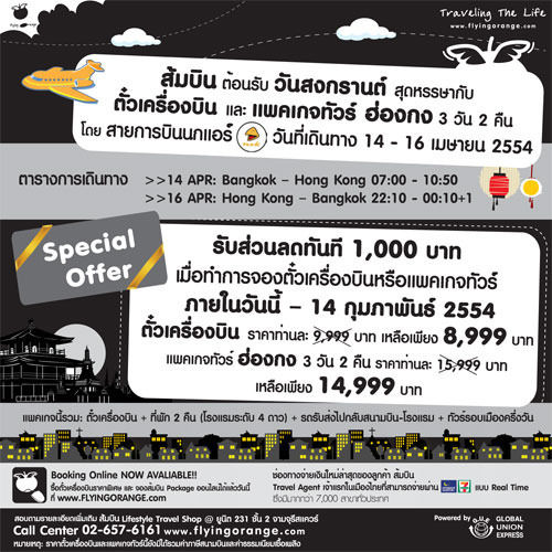 นกแอร์ (Charter Flight) - รถรับส่ง สนามบิน – โรงแรม – สนามบิน - ที่พักแบบห้องคู่ 2 คืน ตามรายการ - ทัวร์รอบเมืองตามรายการ - อาหารเช้า เมนูติ่มซำ 1 มื้อ สำหรับวันที่ 15 เมษายน รายละเอียดเที่ยวบินของสายการบิน : เดินทางทุกวัน กรุงเทพฯ - ฮ่องกง ออกเวลา 07.00 – 10.50 น. เดินทางทุกวัน ฮ่องกง - กรุงเทพฯ ออกเวลา 22.20 – 00.10 น. อัตราแพ็คเกจนี้ไม่รวม : * ภาษีสนามบินไทยและฮ่องกง , ค่าประกันภัยการเดินทาง , Fuel Surcharge * ค่าใช้จ่ายอื่น ๆ นอกเหนือจากที่ระบุในรายการ * ค่าธรรมเนียมธนาคาร กรณีชำระโดยบัตรเครดิต อัตราค่าบริการ : ผู้ใหญ่ (พักห้องละ 2 ท่าน) ท่านละ 15,999.- เก็ก อายุ 2 – 11 ปี มีเตียงเสร้ม ท่านละ 15,999.- เด็ก อายุ 2 – 11 ปี ไม่มีเตียงเสริม ท่านละ 11,999.- กรณีพักเดี่ยว จ่ายเพิ่ม ท่านละ 8,500 ** ไม่รวมค่าภาษีสนามบินไทยและฮ่องกง ท่านละ 3,500.- ** ติดต่อสอบถามเพิ่มเติมและเลือกรับบริการ Trip Planner FREE! ได้ที่ ส้มบิน Life Style Travel Shop ๑ ยูนิค 231 ชั้น 2 จามจุรีแสควร์ Call Center No. 02-657-6161 หรือ www.flyingorange.com