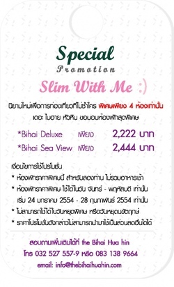 เราขอมอบโปรโมชั่นสุดพิเศษ Slim with me ด้วยห้องพักแบบ Bihai Sea view เพียง 4 ห้อง/วัน เริ่มต้นเพียง 2,444 บาท / คืน สำหรับ 2 ท่าน ไม่รวมอาหารเช้า (อาทิตย์-พฤหัส) วันนี้-28 กุมภาพันธ์ 2554 สามารถดูรายละเอียดเพิ่มเติมและโปรโมชั่นอื่นๆได้ที่ http://www.thebihaihuahin.com/" target='_blank' rel='nofollow'>www.thebihaihuahin.com