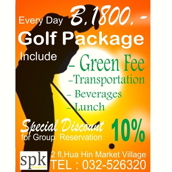 กอล์ฟ เพคเกจ ราคา 1800 บาท ตลอดปี บริการรถรับส่งสนามกอล์ฟ - โรงแรม อาหารกลางวัน เครื่องดื่ม และ กรีนฟี ติดต่อ 032 - 526320 SPK.manangment Co.,Ltd เวลา 10.30 - 20.00 น,