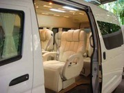 มีรถตู้แบบหรูให้เช่าสำหรับ 9 ที่นั่ง เก้าอี้เบาะหนังพิเศษ สะดวกสบาย แอร์เย็นฉ่ำ พร้อมคนขับ และ สิ่งอำนวยความสะดวกสบายมากมาย เช่น จอแบน 19 นิ้ว DVD, karaoke