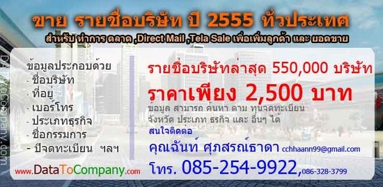 จำหน่าย รายชื่อบริษัท , รายชื่อโรงงาน ปี 2555 ทั่วประเทศ ดูตัวอย่างข้อมูลได้ที่ http://www.datatocompany.com สนใจติดต่อ 085-254-9922