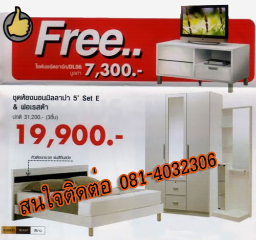 ชุดห้องนอน มิลลาน่า 5 ฟุต Set E + ฟอเรสต้า ฟรีตู้ไซด์บอร์ดอาร์ท 120 ซม. สินค้าจัดรายการ ทั้งชุด ราคา 19,900 บาท บริการจัดส่งฟรี ชุดห้องนอนประกอบด้วย
