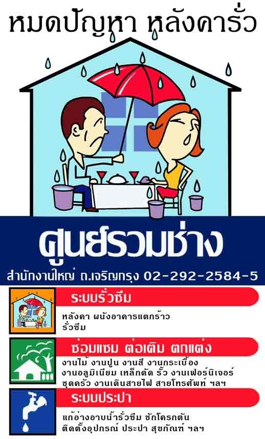 ศูนย์รวมช่าง: ซ่อมหลังคารั่ว ห้องน้ำรั่ว ดาดฟ้ารั่ว หลังคารั่ว กันรั่ว กันซึม น้ำซึมระเบียง น้ำรั่วส่วนต่อเติม ผนังร้าว น้ำซึมผนัง รางน้ำปูนรั่วซึม ผรังร้าง ระบบกันซึม น้ำยากันซึม ช่างซ่อมหลังคา น้ำรั