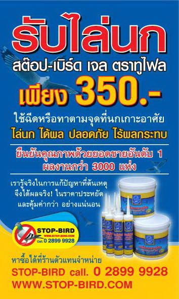 - Stop-Bird Gel เจลไล่นก ป้องกันนก กำจัดนก ใช้ทาตามจุดต่างๆ ที่มีปัญหา สามารถไล่นกพิราบ ไล่นกกระจอก ไล่นกเอี้ยง ไล่นกเขา รวมถึง ไล่กระรอก ไล่แมว ไล่ลิง ดักแมลง ดักแมลงวัน ดักแมลงสาบ ดักจิ้งจก ดักตุ๊กแก กำจัดปลวก กำจัดมด ฯลฯ