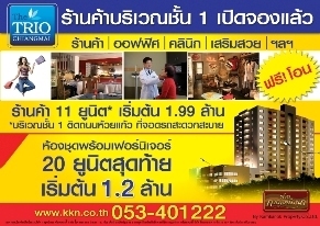 อาคาร ทรีโอคอนโดมิเนี่ยม (ถนนห้วยแก้ว แยกภูคำ) เปิดขาย / ให้เช่า พื้นที่การค้าใต้คอนโด เหมาะสำหรับ ออฟฟิต / ร้านอาหาร / คลินิก 11 ยูนิต เริ่มต้นเพียง 1.99 ล้านบาท คอนโด 189 ยูนิต เข้าอยู่แล้วกว่า 80 % ติดต่อ 053-401222/ www.kkn.co.th