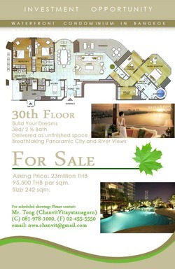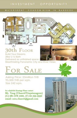 ******************************************************* W A T E R F R O N T C O N D O M I N I U M I N B A N G K O K I N V E S T M E N T O P P O R T U N I T Y ******************************************************** Referral Participation Guarantee Luxury Waterfront Living at The WaterMark Condominium Located in Bangkok’s 5 Star Neighborhood, WaterMark shares the shores of the Chaophraya River with iconic buildings such as The Mandarin Oriental, Shangri-La Hotel, Millennium Hilton, Sheraton, and The Peninsula Hotel. WaterMark Chaophraya Condominium Asking Price: 23million THB 95,500 THB per sqm. Size 242 sqm. 30thFloor Build Your Dreams 3Bd/ 2 ½ Bath Delivered as unfinished space (raw) Breathtaking Panoramic City and River Views Separate Maids Quarters with full bath Building Features Full Service Doorman Building Covered Parking W/ 2 assigned spaces Convenient access to Sathorn and Krungthep Bridges Near Shrewsbury International School Private Boat Shuttle to BTS Taksin Bridge Station Amenities Galore Numerous Pools for Children and Adults Separate Women’s/ Men’s Sauna and Steam Rooms Laundry Room Children’s Playroom Children’s Playground Library Snooker and Pool Room Game Room Table Tennis Area Yoga Room Fitness Center Aerobics Hall Spa Area Tennis Court Multi-Sport Court (basketball, badminton, volleyball) For scheduled showings Please contact: Mr. Tong (ChanvitVitayatanagorn) (C) 081-978-1000, (F) 02-455-5550 email: [email protected]