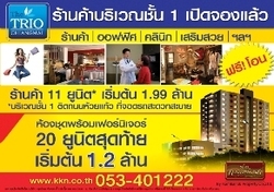 อาคาร ทรีโอคอนโดมิเนี่ยม (ถนนห้วยแก้ว แยกภูคำ) เปิดขาย / ให้เช่า พื้นที่การค้าใต้คอนโด เหมาะสำหรับ ออฟฟิต / ร้านอาหาร / คลินิก 11 ยูนิต เริ่มต้นเพียง 1.99 ล้านบาท คอนโด 189 ยูนิต เข้าอยู่แล้วกว่า 80 % ติดต่อ 053-401222/ www.kkn.co.th