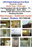 Lumpinee Ville Pahol-Sutisarn For Rent Studio Type : 30.59 sqm. 1 bedroom , 1 bathroom & Balcony Full Furnished with Air Condition , TV , Refrigerator , Microwave, Water Heater, Sofar , Bed,
