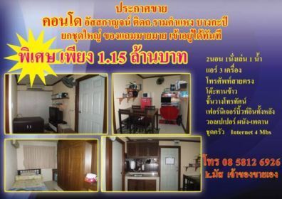 ขายคอนโดอัสสกาญจน์ ย่าน บางกะปิ 2 ห้องนอน 1 ห้องนั่งเล่น 1 ห้องน้ำ ภายในตกแต่ง เบ็ดเสร็จ แอร์ 3 เครื่อง ตู้เย็น โต๊ะทานข้าว โต๊ะวางทีวี ม่าน มู่ลี่ วอลเปเปอร์ เฟอร์นิเจอร์ไม้สักบิวท์อิน สามารถขนเสื้อผ้าเข้าอยู่ได้ทันที ราคาเพียง 1,150,000 บาท ฟรีส่วนกลาง 1 ปี รีบขายไปอยู่ต่างประเทศ หากสนใจจริงๆ ราคาสามารถต่อรองตามความพอใจของคุณ เน็น เราขายคอนโดราคาถูก รับประกันเจ้าของขายเอง ดูห้องได้ ติดต่อ คุณมัส 085-8126926
