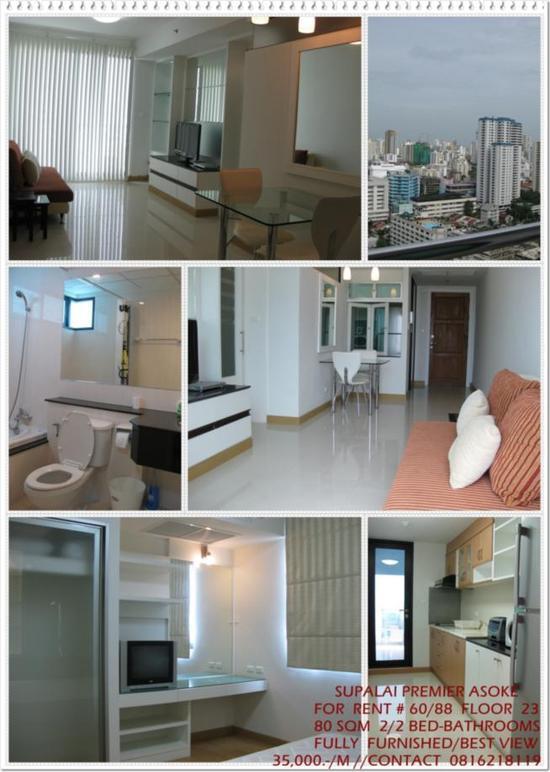 SUPALAI PREMIER ASOKE 80 SQM FLOOR 23 2 BEDROOMS 2 BATHROOMS BEST VIEW FULLY FURNISHED FIXED PARKING 35000.- CONTACT K.RATT 0816218119