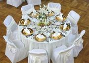 โต๊ะจัดเลี้ยงสีขาว พร้อมผ้าคลุม(สเกิร์ต)สีขาว