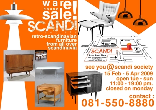 Ware House Sale ! Retro-Scandinavian Furniture From all over Scandinavia 15 February – 5 April 2009 Open Tue – Sun 11:00 – 19:00 PM. Closed on monday Contact : 081-550-8880 See you @ Scandi Society Palm Street Plaza เลียบทางด่วนรามอินทรา-อาจณรงค์ ถ.ประดิษฐ์มนูธรรม ( ติดโกลเด้น เพลส พระราม 9 )