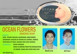 สบู่สมุนไพรโอเชี่ยนฟลาวเวอร์ มีส่วนประกอบที่สำคัญคือ ไคโตรซาน ซึ่งเป็นสารที่สกัดจากเปลือกกุ้ง กระดองปู้ ไคโตซาน มีคุณสมบัติเป็น Anti Bacteria, Anti-Fungus จับไขมันส่วนเกินได้ดีมาก ดูแลปัญหาสุขภาพผิว ปรับสภาพผิวหน้าที่มีปัญหา สิว ฝ้า หน้ามัน ให้มีสภาพดีขึ้น ลดความมันบนใบหน้า ทำความสะอาดอย่างสะอาดมาก ใช้ต่อเนื่องหน้าจะดูอ่อนเยาว์ หน้านุ่ม เนียนใส สามารถล้างเครื่องสำอางได้สะอาดหมดจด ใช้ชำระล้างทั้งใบหน้า ทั้งร่างกาย ช่วยปรับสภาพผิวที่มีปัญหา สิว ฝ้า กระ ผิวหน้ามัน ดูดจับไขมันส่วนเกินบนใบหน้าและร่างกาย ทำให้ผิวนุ่มนวลแจ่มใส ชุ่มชื้น สามารถใช้ล้างเครื่องสำอางค์ได้สะอาดหมดจด จากประสบการณ์ผู้ใช้อย่างต่อเนื่อง จะสังเกตว่าหน้าดูอ่อนเยาว์สบู่นี้ใช้ได้ทั้ง ใบหน้าและร่างกาย สบู่โอเชียนฟลาวเวอร์ ส่งออกไปหลายประเทศ ทั้งตะวันออกกลาง (เช่น ดูไบ อิหร่าน ตุรกี) จีน เวียตนาม เขมร ญี่ปุ่น ออสเตรเลีย