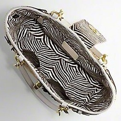 A fresh take on a vintage look: a classic straw tote silhouette with pretty flower appliqués and a retro turnlock is updated with modern additions like leather and metal and the hidden surprise of a zebra-print lining inside.