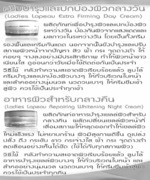 ปัญหาสิวฝ้า เติมหน้า กระ จุดด่างดำ แก้ได้จริง ด้วย Ladies Lapeau สินค้ามาแรง ใช้ดีบอกต่อ...... ผลิตภัณฑ์ เลดี่ ลาเพิอ หาหมอหน้ามานานแก้ไมหายลองใช้ผลิตภัณฑ์ เลดี่ ลาเพิอ ยืนยันจากผู้ใช้จริง ประทับใจสุดๆ ช่วงแนะนำ แถมฟรี สบู่ไข่มุกขนาด 60 กรัม ***จัดส่งให้ฟรีค่ะ สนใจติดต่อ : คุณปุ๊ก 089-172-9933 ใบขออนุญาตเลขที่สธ.0805/456 ได้ถูกค้นคว้าวิจัย และควบคุมการผลิตโดยเภสัชกร และทีมงานผู้เชี่ยวชาญมืออาชีพ เพื่อแก้ไขปัญหาผิวหน้าของชาวเอเชียโดยเฉพาะ ไม่ว่าหญิงหรือชายจึงมั่นใจได้ถึงคุณภาพ และมาตรฐานของผลิตภัณฑ์ ผลิตภัณฑ์เลดี้ ลาเพิอ ผลิตจากสรสกัดจากธรรมชาติที่คัดสรรเป็นพิเศษเพื่อมอบแต่สิ่งดีๆ สำหรับทุกท่าน มีการตรวจสอบ และทดลองใช้จนเป็นที่มั่นใจในคุณภาพด้วยสารสกัดจากธรรมชาติที่มีประโยชน์ต่อผิวพรรณจึงสามารถแก้ปัญหาสิว, ฝ้า, กระจุดด่างดำควมหมองคล้ำทำให้ใบหน้าขาวเนียน กระจ่างใส ดูอ่อนกว่าวัยอย่างเห็นได้ชัด และเมื่อหายแล้วสามารถหยุดใช้ได้โดยไม่ก่อให้เกิดปัญหาต่อผิวหน้าขอท่านแต่อย่างใด แต่ควรใช้เป็นประจำอย่างต่อเนื่องเพื่อปกป้อง และดูแลผิวหน้าของคุณให้คงความขาวเนียน กระจ่างใส อ่อนเยาว์ได้ยาวนาน และปัญหาสิว, ฝ้า, กระ,จุดด่างดำ รอยดำจากสิว ผิวหน้าหมองคล้ำ หยาบกร้าน ริ้วรอย เผยผิวสวยใส อ่อนเยาว์ ขาวใส อย่างเป็นธรรมชาติด้วยประสิทธิภาพ สารสกัดจากธรรมชาติ ผลลัพธ์ 8 ประการ ที่พิสูจน์ได้ใน 4 สัปดาห์ 1. ยัยนั้งการสร้างเม็ดสีผิว ทำให้ผิวกระจ้างใสแบบธรรมชาติ 2. ช่วยผลัดเซลล์ผิว และเผยผิวใหม่ที่สดใสแข็งแรง 3. กระตุ้นการสร้างคอลาเจน อีลาสติน ทำให้ผิวเนียนเรียบ ริ้วรอย และหลุมสิวดูตื้นขึ้น 4. ต่อต้านอนุมูลอิสระ ลดการอักเสบของสิว สิวผด และช่วยควบคุมความมัน 5. รักษาสมดุลของน้ำใต้ผิว ทำให้ผิวชุ่มชื้น ไม่แห้งกร้าน 6. ป้องกันรังสี UVA, UVB สาเหตุของการเกิดฝ้า, กระ, จุดด่างดำ 7. ช่วยให้ผิวตึงกระชับสดใส ดูอ่อนกว่าวัย 8. ช่วยลดรอยฝ้า กระ จุดด่างดำให้จางลง ครีมบำรุง และป้องกันผิวกลางวัน (Ladies Lapeau Extra Firming Day Cream) ผลิตภัณฑ์เพื่อบำรุงผิว และปกป้องผิวระหว่างวัน ป้องกันผิวจากแสงแดด และมลภาวะในระหว่างวัน โดยเป็นทั้งครีมรองพื้น และครีมกันแดด นอกจากนั้นยังบำรุง และปรับสภาพผิวหน้าจากปัญหา สิว ฝ้า กระ จุดด่างดำ ให้ค่อยๆ จางลงอย่างมีประสิทธิภาพ ทำให้ผิวหน้าขาว เนียนใส ดูอ่อนกว่าวัยเมื่อใช้ติดต่อกันเป็นประจำ วิธีใช้ หลังทำความสะอาดผิวเรียบร้อยแล้ว ทาผิวด้วยครีมบำรุง ให้ทั่วใบหน้า และลำคอ อย่างนุ่มนวล ให้ครีมซึมเข้าสู่ผิว ควรใช้เป็นประจำทุกเช้า อาหารผิวสำหรับกลางคืน (