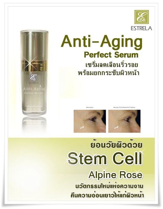 เซรั่มลดริ้วรอย ย้อนวัยให้กับผิวหน้าด้วยด้วยสารสกัดจาก เซลล์ต้นกำเนิด (Stem Cell) ที่สามารถช่วยลดเลือนริ้วรอย บนใบหน้า และยกกระชับผิวหน้า ได้อย่างมีประสิทธิภาพสูงสุด โดยรู้สึกได้ทันทีที่ใช้ พร้อมทั้งเผยผิวกระจ่างใสอย่างเห็นได้ชัด