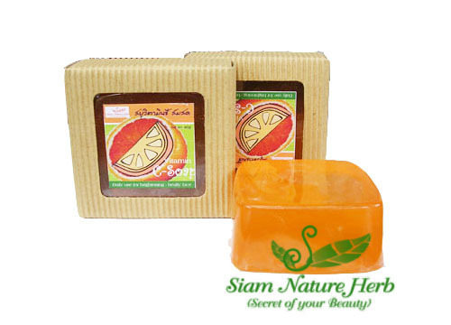 Vitamin C SOAP สบู่หน้าใสวิตามินซีส้มสด มีส่วนผสมของ Vitamin C Powder และผลไม้ตะกลูลส้มนานาชนิด ใช้ล้างหน้าช่วยให้ผิวหน้าขาวใส ไร้ความมัน 85 กรัม