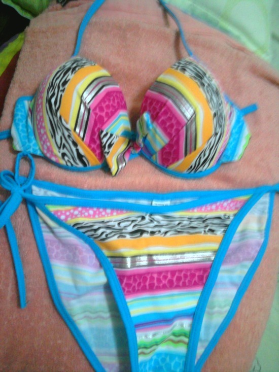 บีกินนี่สีสดใส แบบผูกคอ และผูกด้านหลัง เสริมฟองน้ำด้วยค่ะ ซื้อมา 3 วันเอง เอาเข้าจิงไม่กล้าใส่ค่ะ อิอิ