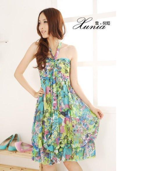NEW !! ใหม่ค่ะ FZY ชุดเดรสแฟชั่นเกาหลีผ้าชีฟองแบบคล้องคอลายดอกไม้โทนสีเขียวแต่งระบายชายสวยงามค่ะ