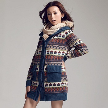 แฟชั่นหน้าหนาว ใหม่ค่ะ JK2 เสื้อกันหนาวแขนยาวผ้า Knit ตัวยาวสีน้ำเงินพิมพ์ลายแบบ nordic โทนสีครีมติดกระดุมด้านหน้ามีกระเป๋า 2 ข้างค่ะ