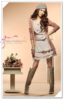 New Update ! ใหม่ค่ะ Tokyo Fashion ชุดเดรสแฟชั่นเกาหลีตัดต่อเสื้อคลุมแขนยาวผ้า knit สีชมพูเสื้อยืดสีเทาลายขาวคลุมด้วยผ้าชีฟองสีเทาด้านนอก