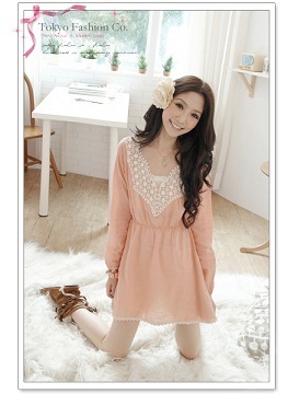 New Update ! ใหม่ค่ะ Tokyo Fashion เสื้อผ้าแฟชั่นเกาหลีแขนยาวผ้าฝ้ายสีชมพูแต่งโครเชย์ถักช่วงอกติดยางยืดเอวชายเสื้อติดกุ๊นลูกไม้