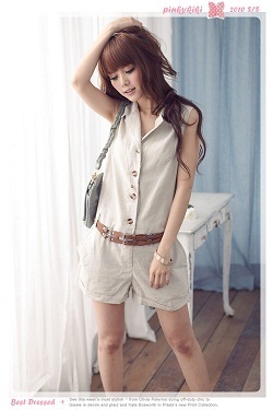 New HOT !! FZY ใหม่ค่ะ ชุดเดรสกางเกงขาสั้นผ้าคอตตอนคอปกสีกากีติดกระดุมด้านหน้า+เข็มขัดตามแบบ