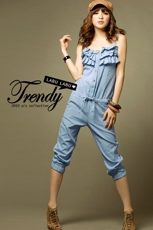 New Item FZY ใหม่ค่ะ ชุดเอี๊ยมกางเกงสายเดี่ยวผ้ายีนส์สีฟ้าอ่อนติดระบายอกและกระดุมมีสายคาดรูดผูกช่วงเอว