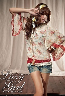 Update !! Tian-Mu ใหม่ค่ะ เสื้อผ้าแฟชั่นเกาหลีแขนยาวระบายผ้าชีฟองสีครีมลายดอกไม้เล็กๆสีแดงแต่งกุ๊นคอและชายเสื้อด้วยโครเชย์ถัก