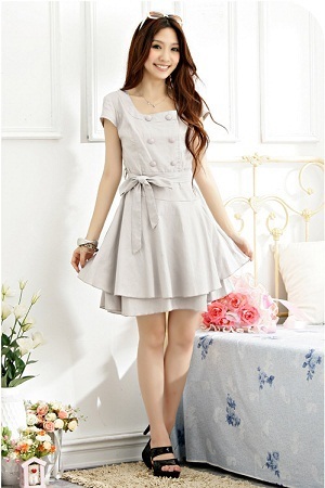 NEW !! ใหม่ค่ะ JK2 ชุดเดรสแฟชั่นเกาหลีแขนสั้นคอกลมสีเทาอ่อนแต่งกระดุมด้านหน้ามีสายผูกช่วงเอวชายกระโปรง 2 ชั้นค่ะ