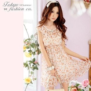 New ใหม่ค่ะ Tokyo Fashion ชุดเดรสแฟชั่นเกาหลีคอระบายชั้นๆผ้าชีฟองสีขาวลายดอกไม้สีฟ้าส้มติดยางยืดเอว