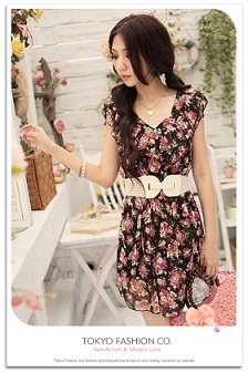 New ใหม่ค่ะ Tokyo Fashion ชุดเดรสแฟชั่นเกาหลีแขนกุดผ้าชีฟองคอวรสีดำลายดอกไม้สีแดงแต่งระบายคอเสื้อติดยางยืดเอวค่ะ