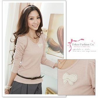 สินค้าใหม่ค่ะ Tokyo Fashion เสื้อผ้าแฟชั่นเกาหลีแขนยาวผ้ายืดสีชมพูช่วงแขนจับจีบย่นๆติดโบว์มุกช่วงอกค่ะ
