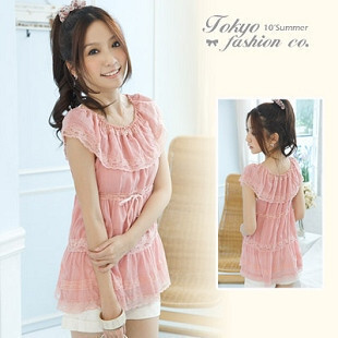 Tokyo Fashion มาใหม่ค่ะ เสื้อแขนกุดคอระบายสีชมพูแต่งกุ๊นลูกไม้ มีริบบิ้นรูดผูกเข้ารูปช่วงใต้อกค่ะ
