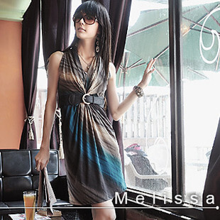 Tian-Mu มาใหม่ค่ะ ชุดเดรสแฟชั่นเกาหลีแขนกุดคอวีโทนสีน้ำตาลฟ้า รูดจับจีบด้านหน้า
