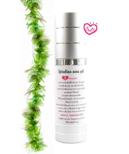 - ช่วยต่อต้านเชื้อแบคทีเรีย อันเป็นสาเหตุหลักของการเกิดสิว จุดเด่นของ Spirulina Gel **มีกลไกในการรักษาสิวมากกว่า ผลิตภัณฑ์ที่ใช้ รักษาสิวตัวอื่นๆ เพราะนอกจากจะช่วยให้สิวยุบแล้วยังป้องกันและช่วยไม่ให้เกิดรอยดำหรือแผล เป็นอีกด้วย **ผลิตจากแล็บที่มีคุณภาพ ผ่านการตรวจสอบมาตรฐาน GMP จากกระทรวงสาธารณสุข **เป็นเครื่องสำอางที่มีความปลอดภัย ไม่มีส่วนผสมของ “ยา” จึงไม่จำเป็นต้องอยู่ในความควบคุมของแพทย์ ข้อควรระวัง!!!! ครีมสมุนไพรบางตัว อาจอ้างว่าสกัดจากธรรมชาติ แต่ยังคงมีส่วนผสมของสารอันตราย ที่ใช้กัดสีผิวเจือปนอยู่ มากบ้างน้อยบาง ซึ่งครีมเหล่านี้มักจะทำให้หน้าขาว และสิวยุบเร็วจนน่าตกใจ วิธีใช้ : ล้างหน้าให้สะอาด ลูบไล้ให้ทั่วใบหน้า เช้า – ก่อนนอน เป็นประจำทุกวัน หรือทาบนใบหน้าบริเวณที่เกิดสิวบ่อยๆ ระหว่างวัน ** แนะนำชุดรักษาสิว ** ชุดรักษาสิวอักเสบ ( สบู่ขิง + Vit C Acne Gel) > ช่วยลดสิวอักเสบได้เร็ว ใช้อย่างต่อเนื่องสิวใหม่จะไม่ทิ้งรอยดำ และรอยสิวเก่าจะค่อย ๆ จางลง อุดมไปด้วยสารบำรุงผิวทั้งโสม วิตามิน C แตงกวา คนไม่เป็นสิวก็สามารถใช้ได้อย่างปลอดภัย ชุดรักษาสิวที่เห่อจากการแพ้ ผิวบอบบางแพ้ง่าย ( Tea Tree Wash > Spirulina Gel) ช่วยบรรเทาสิวที่เห่อจากการแพ้สารต่าง ๆ ส่วนผสมของ Zinc และ Spirulina ช่วยเคลือบปกป้องผิวหน้าไม่ให้โดนมลภาวะภายนอก เสมือนอยู่ในเปลือกไข่ เป็นการรักษาโดยให้ผิวฟื้นฟูตัวเองจนสมดุล กลับสู่สภาพปกติ โดยไม่พึ่งยาชนิดสเตียรอยด์ที่มีผลข้างเคียงสูง ถือเป็นการรักษาอาการหน้าบางแพ้ง่ายที่อิงหลักกลไกธรรมชาติของผิวและปลอดภัย ที่สุดค่ะ ควรเก็บให้พ้นจากแสงแดดและที่ร้อนจัด เพื่อคุณภาพที่ดีของสินค้า // ความคิดเห็นจากลูกค้า 2-beauty.com // ความคิดเห็นที่ 1 : เย้…หายแล้วค่ะ