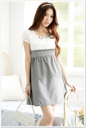 สินค้าใหม่ค่ะ JK2 ชุดเดรสแฟชั่นเกาหลีแขนสั้นสีขาวแต่งกระดุมที่คอเสื้อตัดต่อชายกระโปรงผ้าคอตตอนสีเทาติดยางยืดเอวด้านหลัง