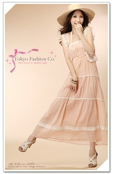 NEW !! ใหม่ค่ะ Tokyo Fashion Maxi เดรสยาวสายเดี่ยวผ้าคอตตอนสีชมพูแต่งลูกไม้สีครีมจับสม็อกใต้อก
